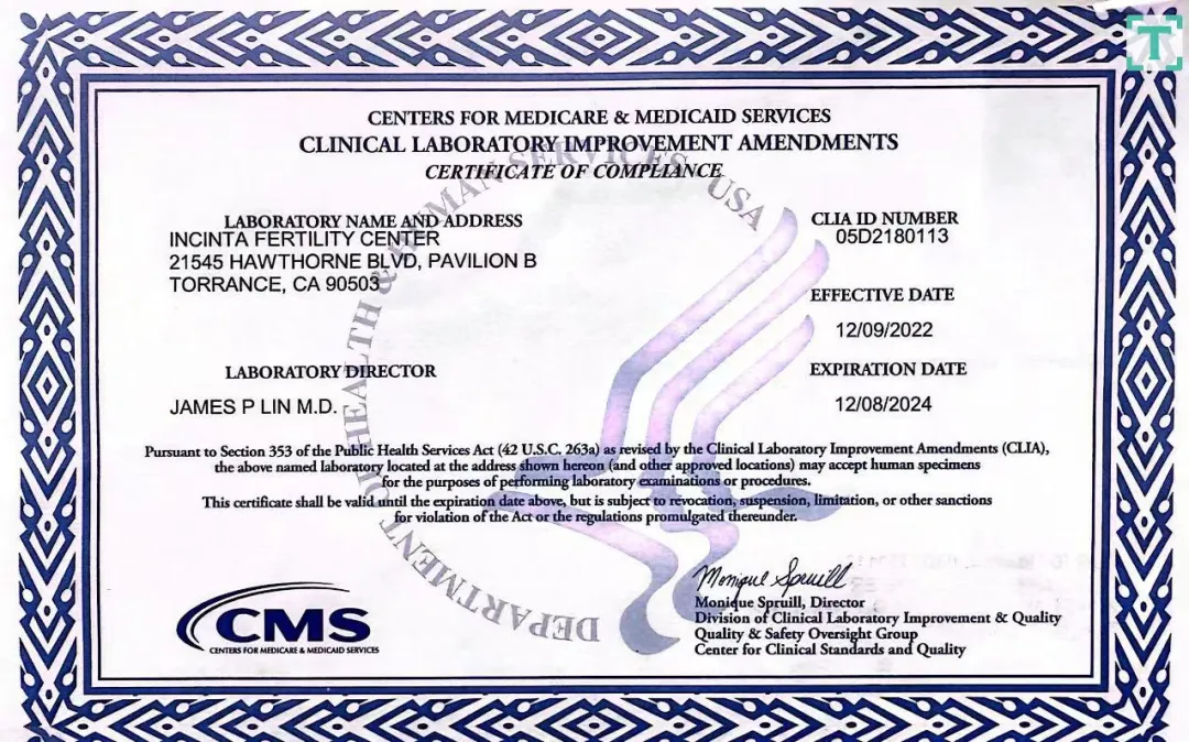 INCINTA Fertility Center胚胎实验室成功获批最高级别的CLIA证书认证。CLIA(ClinicalLaboratory Improveme...